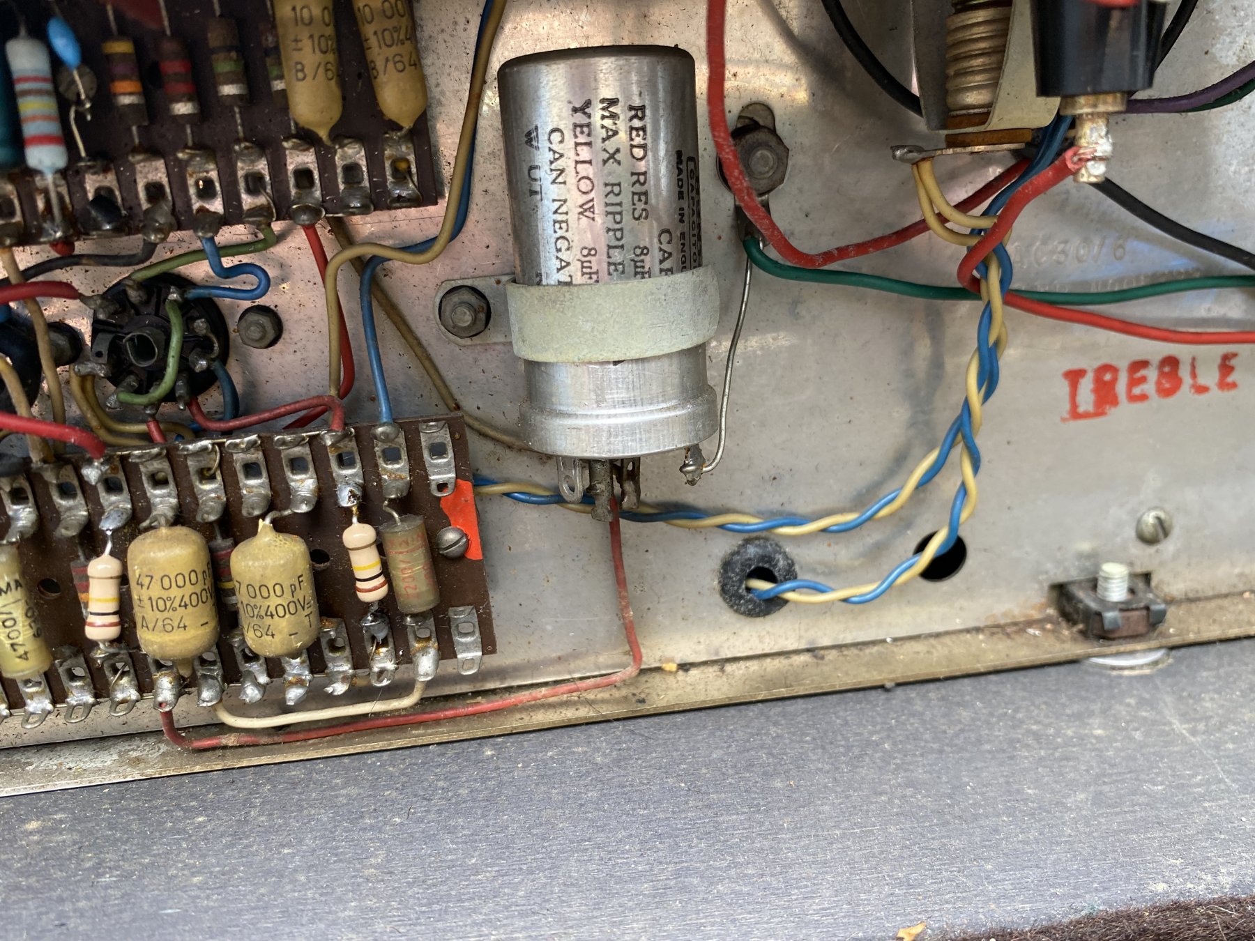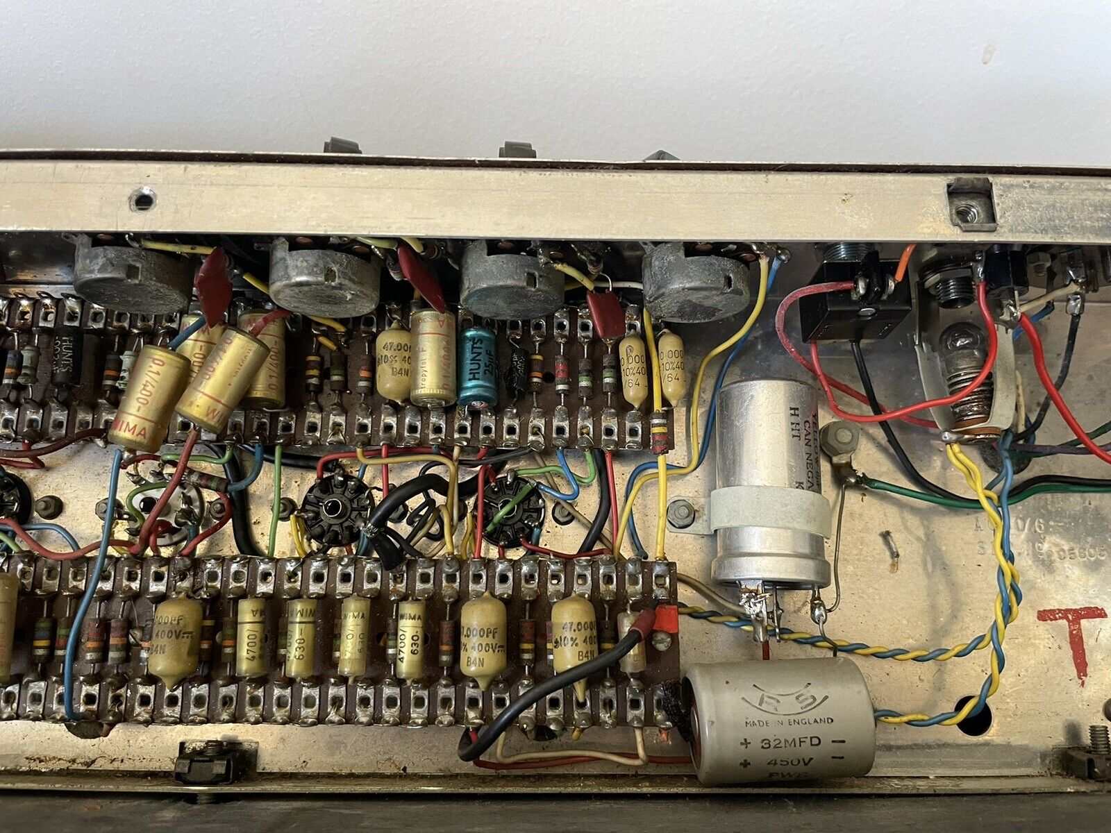 A mixture of Mullard mustard and WIMA coupling capacitors in the preamp. Speakers are Celestion silvers - T1088 - which had come in by May 1964. The mustards have the date code B4N = Blackburn factory, second quarter of 1964. One of the blue Hunts electrolytics has the date code "HWT" = 20th week of 1964.