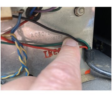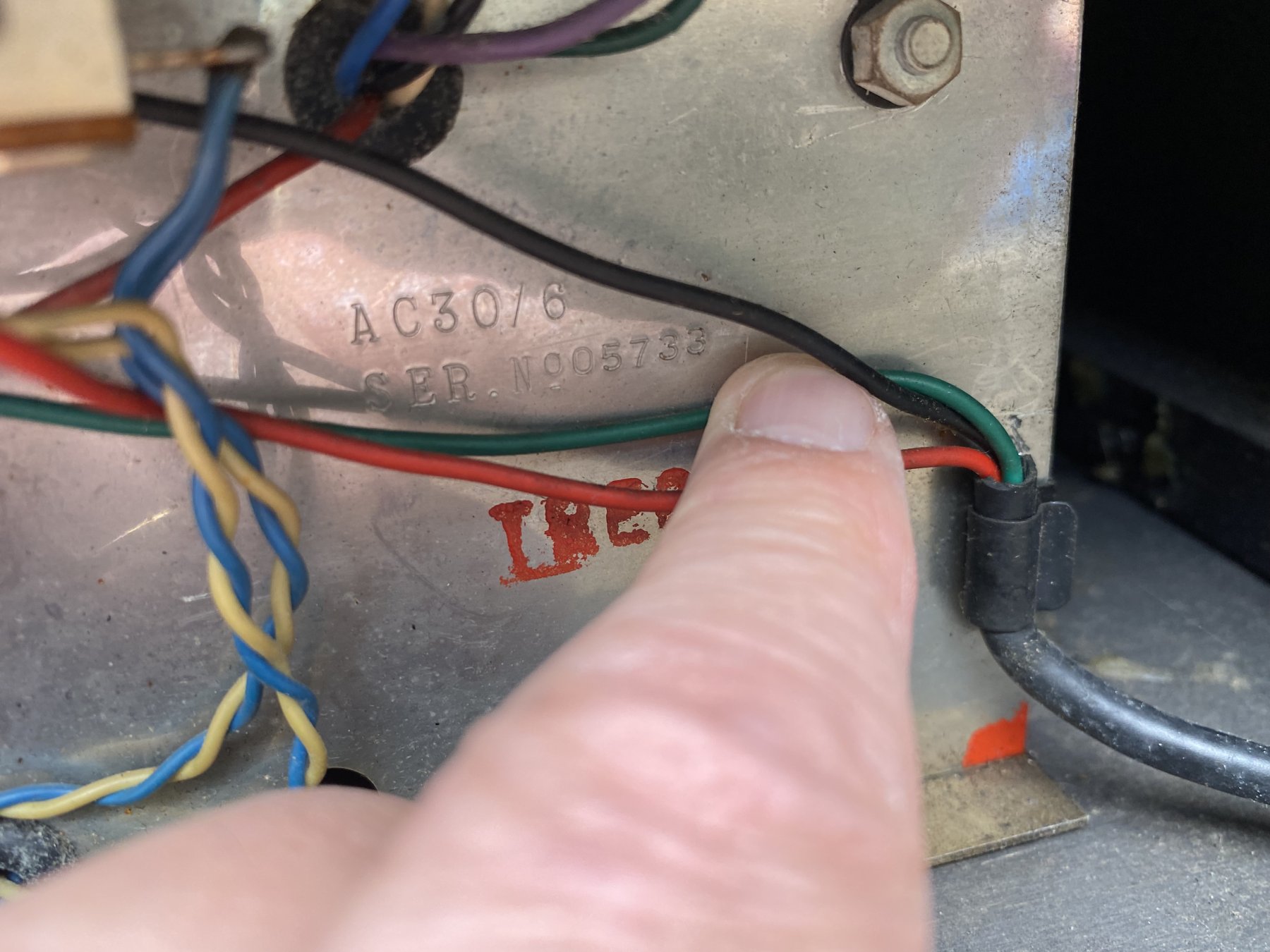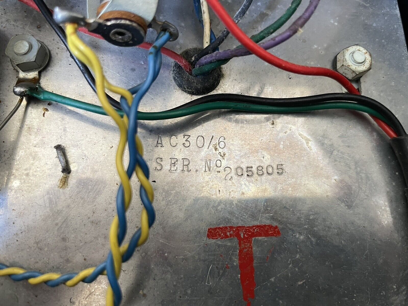 A detail of serial number 14625 (chassis produced by Burndept). At right, the "T" in red of "TREBLE", and above that part obscured by wires, the chassis number. A clear picture of the number can be found in the entry for the amp towards the end of this page. Also in view underneath the "T" one of the three cut-outs in the aluminium behind the cage nut.