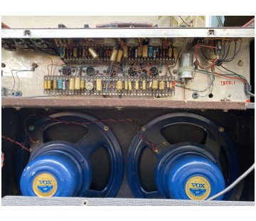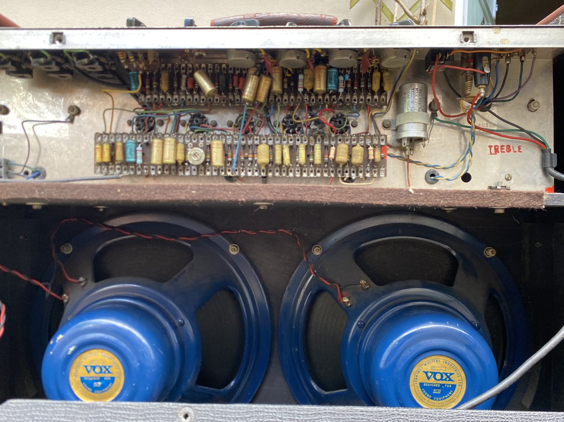 Copper panel. Mullard capacitors with date codes "A/64" and "B4N" = first and second quarters of 1964. The spealer compartment contains one Celestion blue and one Celestion silver, non-original wiring.