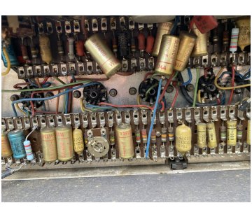 Chassis number 05901. In the preamp, Mullard mustards with "A/64" and B/64" date codes = first and second quarters of 1964; and Hunts caps with "WIT" and "WUT" = 13th and 16th weeks of 1964. The speakers are later T1088s supplied by Celestion to Thomas Organ in the USA.