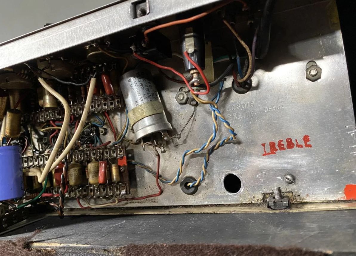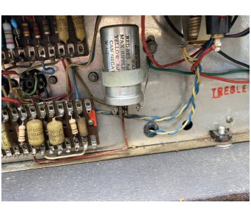 The chassis, assembled by Westrex, did not leave the factory with this cabinet (or serial number plate). There are 0.047uf caps at C7 and C5. Treble models should have 0.01uf. WIMA signal capacitors in the preamp; gold-coloured TCC cathode bypass capacitors in the preamp.
