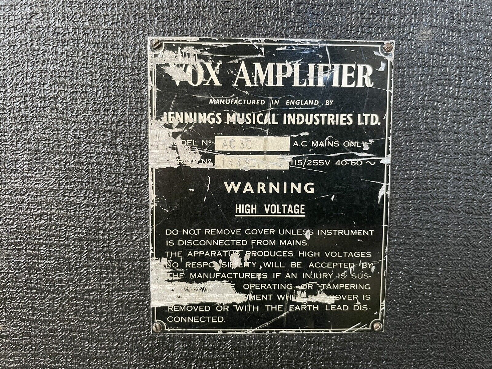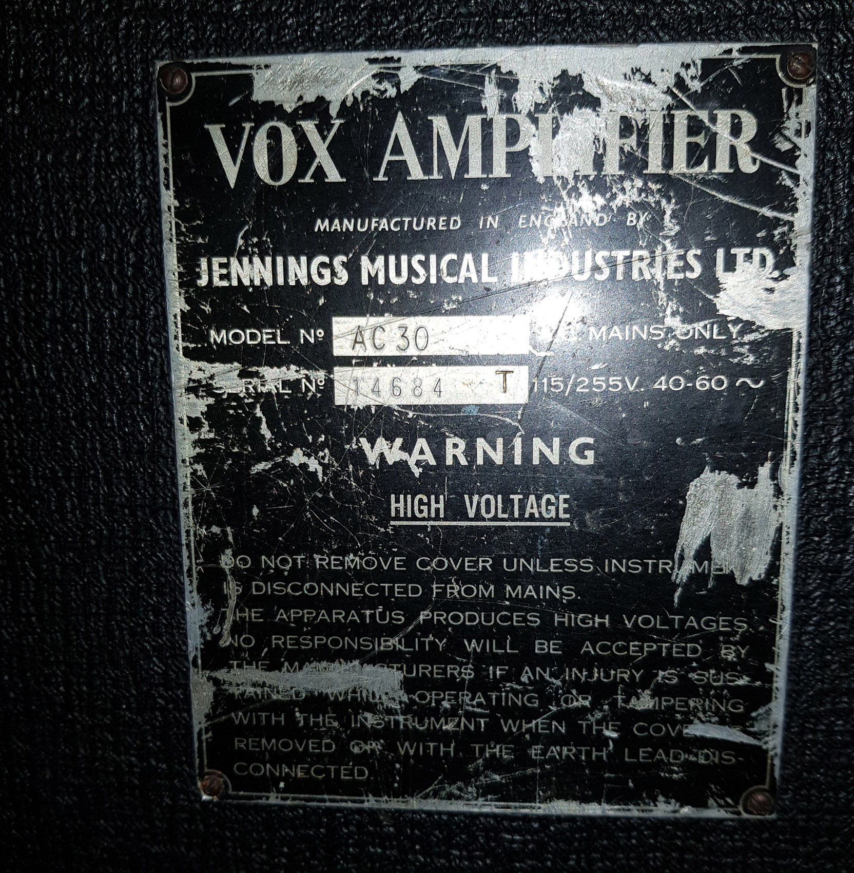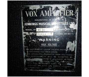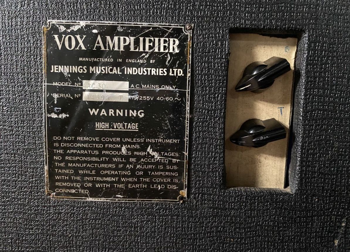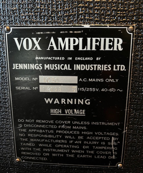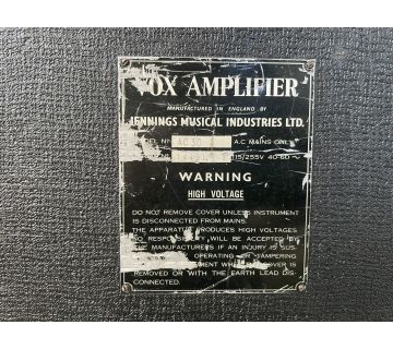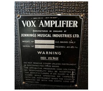 Exported to Denmark early on. See also serial number 14317 immediately below. "Europaisk Musik Import" acted as agent/distributor for Vox in Denmark through to 1970 and probably beyond. Voltage and frequency rating whited out on the serial number plate.