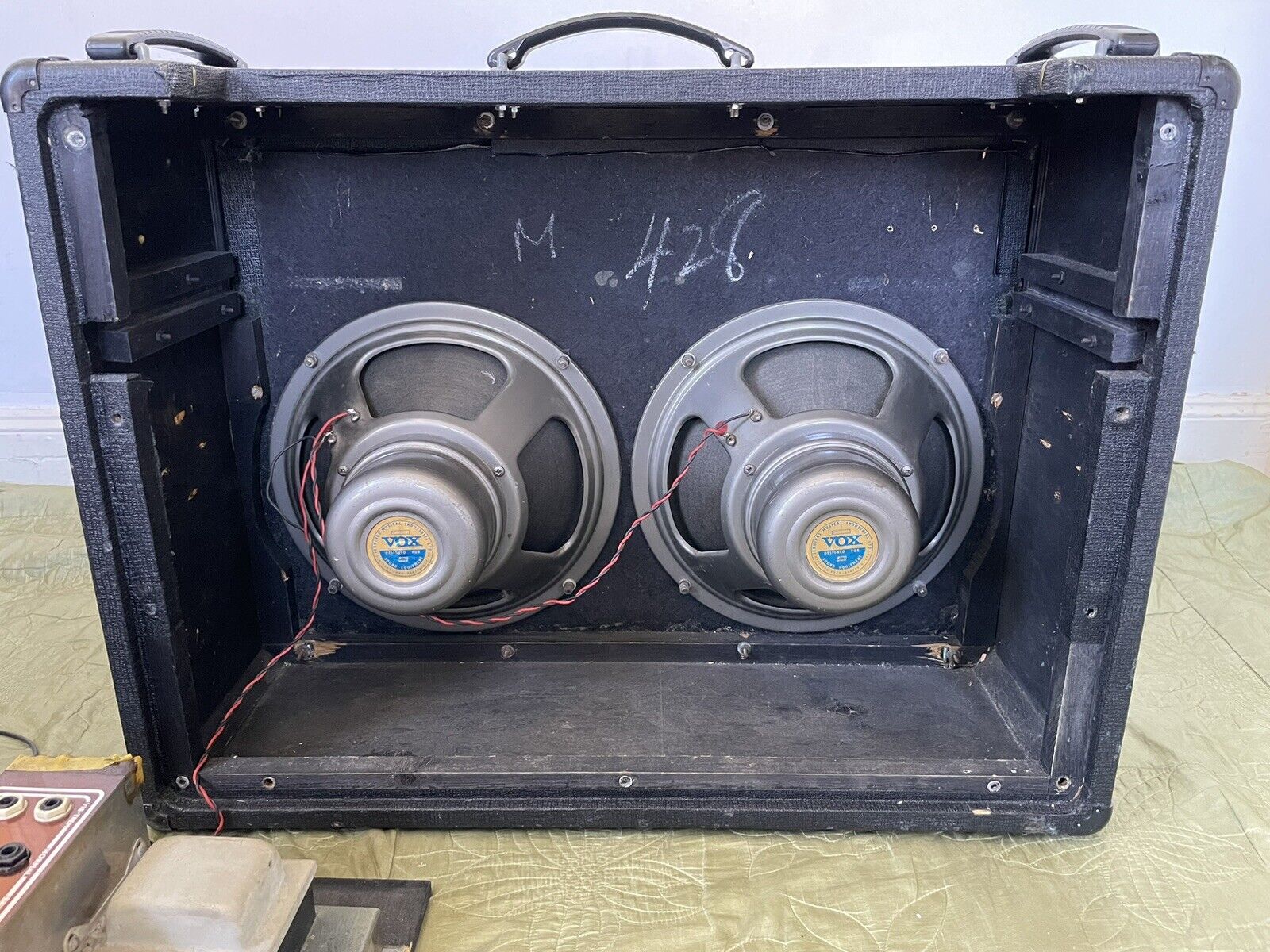 Grrille cloth renewed; two-pin plastic corner protectors added. Chassis number 05805. Albion transformers. A mix of WIMA and Mullard capacitors in the preamp, the latter with B4N date codes = second quarter of 1964. Hunts caps have "WAT" and "HHT" = 19th and 22nd weeks of 1964. One of the original Mullard EL84s has the paint code "LD" = April 1964. Celestion silvers, original wiring present. The cab is numbered "428" in chalk.