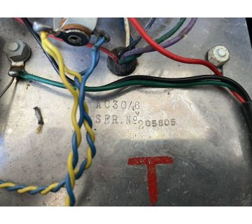 Chassis number 05237. Stamped "T" on the serial number plate, though the amp is evidently a "Top Boost" model. Original side stands with ball castors still in place. Silver Celestion T1088s. Thanks to Harvey for the pictures.