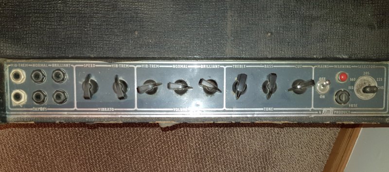Chassis assembled by Burndept; Albion transformers; grey panel with integral Top Boost controls; still the link voltage selector. Chassis number either 05514 or 06514. In the preamp, Mullard mustard caps with "A4N2 and "B4N" = first and second quarters of 1964.