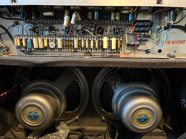 Chassis assembled by Burndept; Albion transformers; grey panel with integral Top Boost controls. In the preamp, Mullard mustard capacitors with date codes "A/64" and "B4N" = first and second quarters for their manufacture. The main preamp filter cap has the date "WHT" = 12th week of 1964. Silver Celestion T1088s.