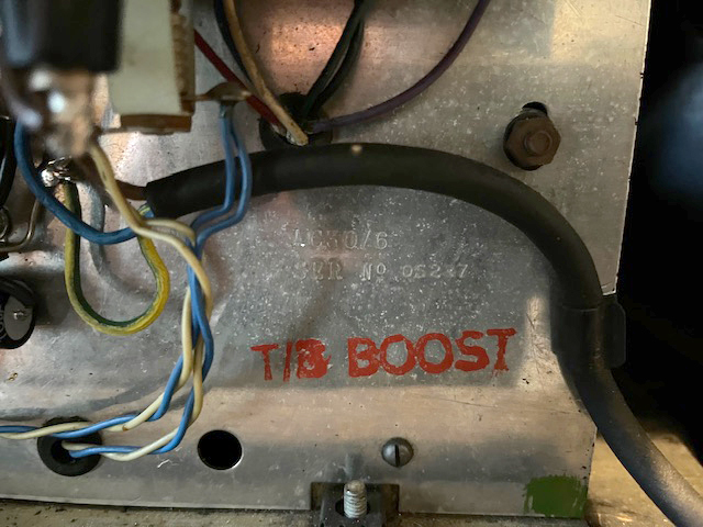"TB" - also stamped on the plate - indicates that the amp was fitted with the Top Boost circuit.
