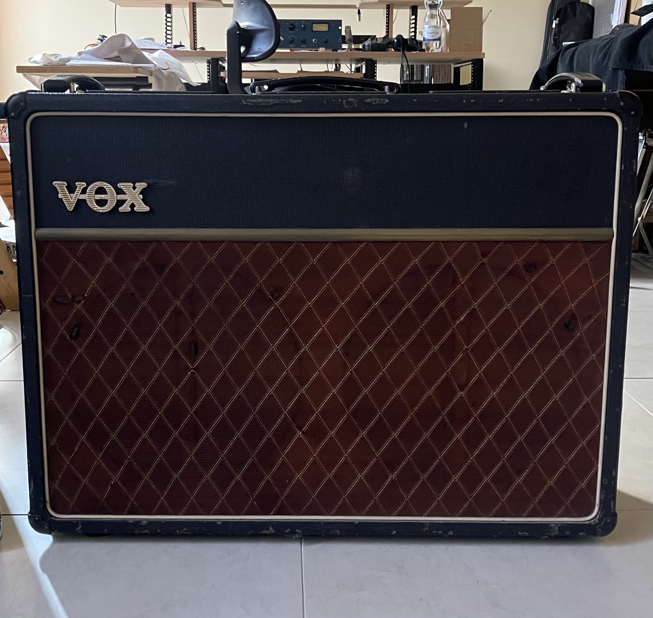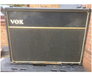 Pictures of the exterior only at present. Grey panel, dome voltage selector. Cabinet covered in textured black vinyl; brown grille cloth. The "VOX" logo is in single letters. In the speaker compartment, a pair of recent Fanes.