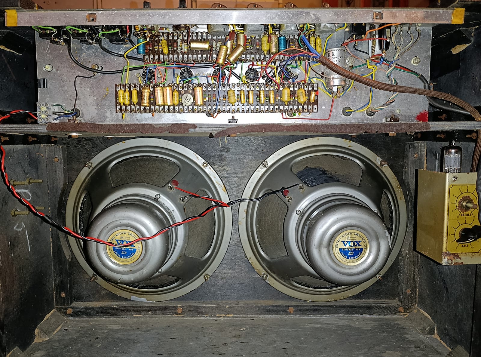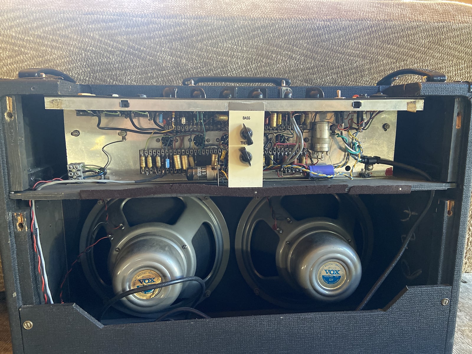 The original speakers look to be in place though the wiring in the compartment is new. Centre cabinet handle no longer present; the outer handles have rectangular panels but no "VOX" logo.