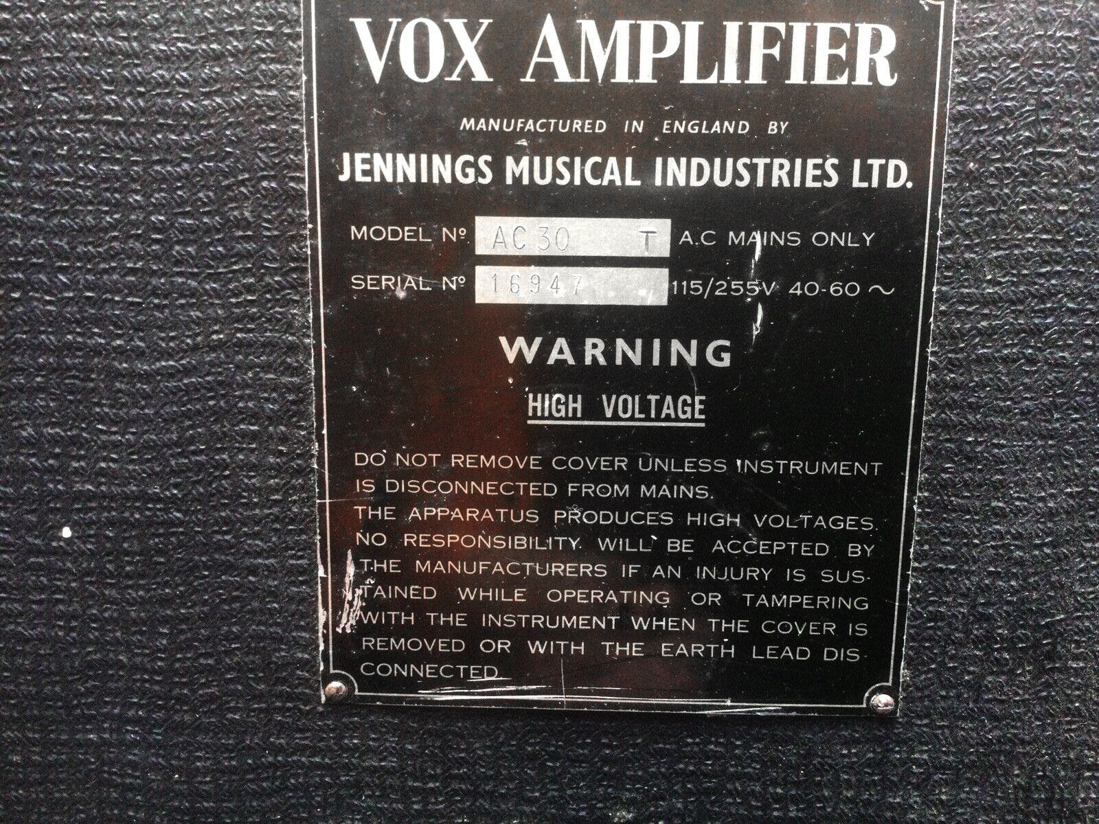 The "N" for Normal voicing is stamped in the lower panel of the serial number plate. The plate does not seem quite right for the cab - square corners to the back boards but covered in basketweave vinyl (?) - chassis (copper panel) or speakers (Celestion blues).