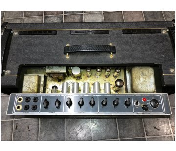 Chassis number 10669. Woden transformers with date codes "JV" and "KV" = September and October 1964 for their manufacture. In the preamp, Mullard mustards with "B4N" and "C/64" = second and third quarters of 1964. The original speakers and footswitch are present. Thanks to Giovanni for the pictures.