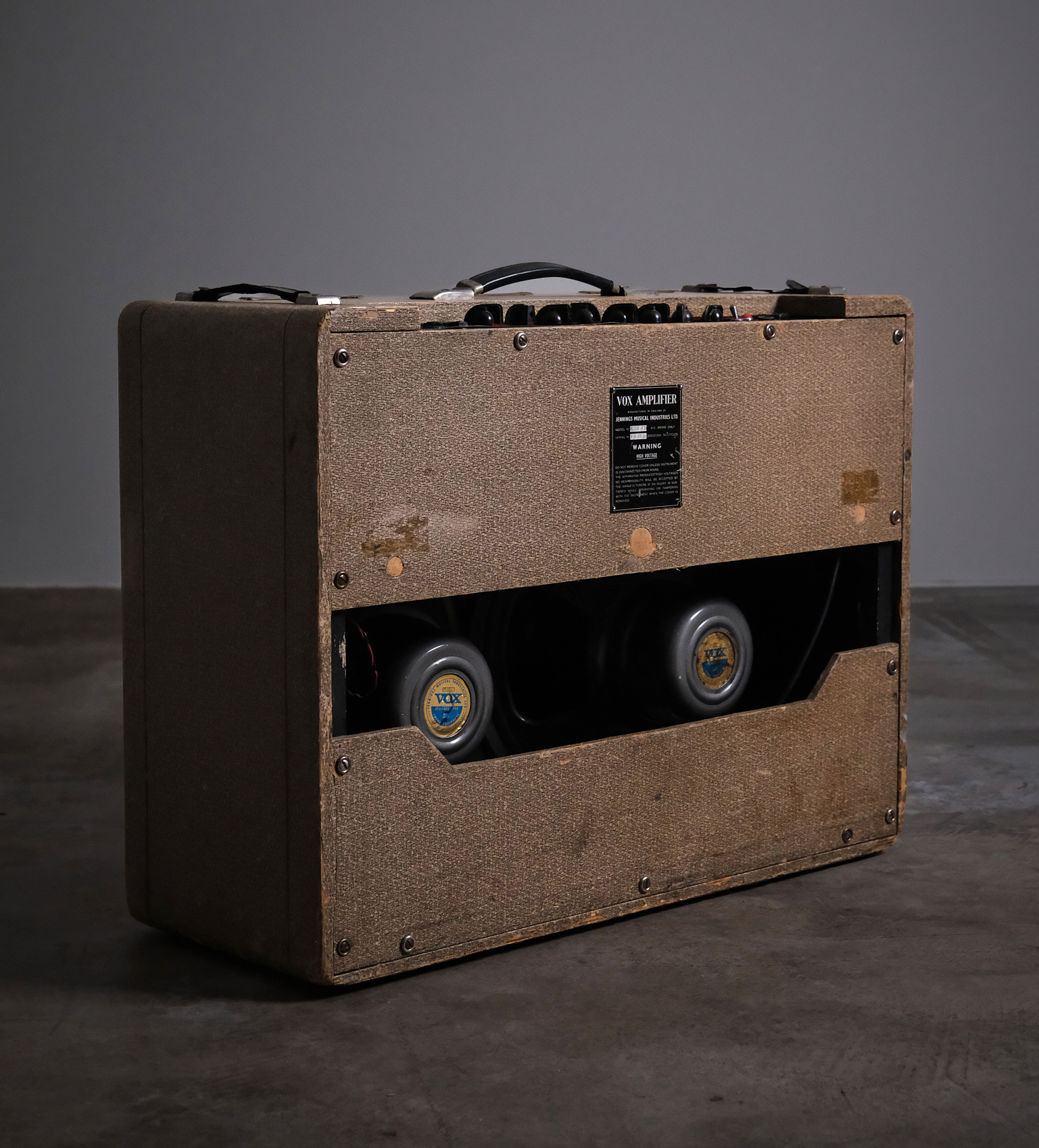 Haddon tranformers; Radiospares choke. On the control panel, a jack socket added for the footswitch, a fairly common thing. The original round switch, with raised top, is present. Almost all capacitors and resistors in the preamp have been renewed, probably also underchassis components too. The original pots remain, an "I" for 1961 just visible in the pictures on one. The speaker wiring looks to be the original pink and white/yellow, though the Vox label of the left-hand speaker is broken in such a way as to suggest the end bell was removed at some point - possibly for a recone? At one time names were hand painted on the cabinet's vinyl front and back, the paint since removed.