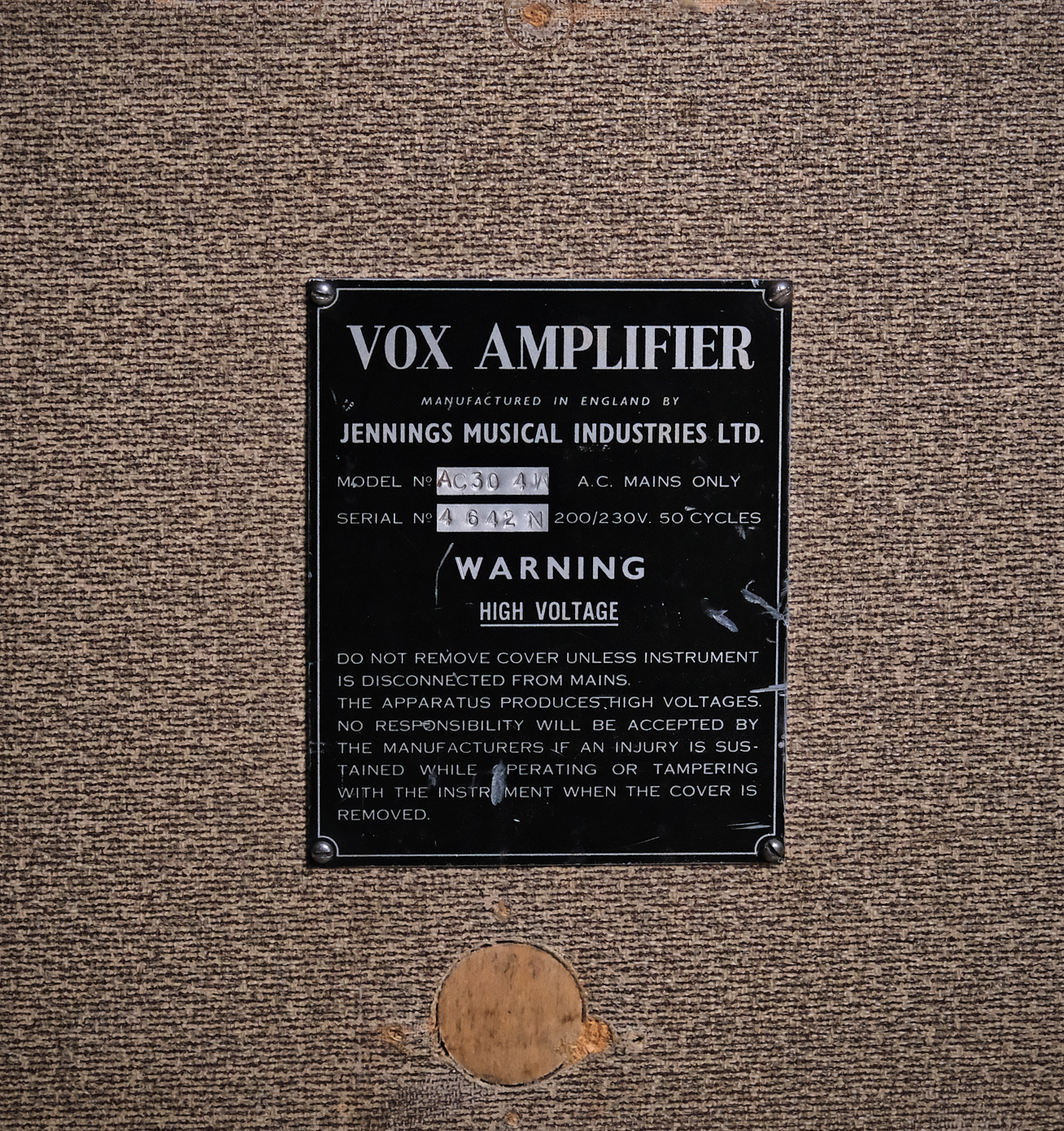 The explicit designation of the amp as a "4" on the plate (something not found on the TV front amps) was a means of making record keeping easier (the registers kept of sales and despatches). Since AC30/4s and AC30/6s had serial numbers in the same sequence (in the range low 4200s to low 4700s), one could not tell simply from the number alone whether the amp was of one type or the other. Black panel AC30/6s (Twins and Super Twins) continued on their own from the low 4700s to mid 4900s.