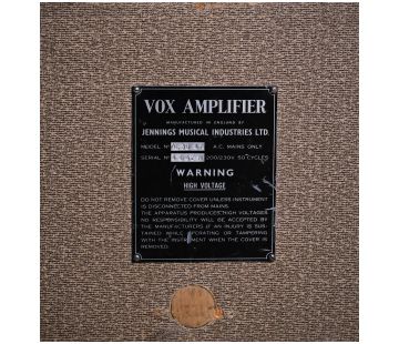 Westrex-made chassis. "AC30 4W" "4606 N" The "N" for "Normal voicing" was stamped over a "B" for "Bass". The cab is later - from 1964, with rounded corners to the backboards, basketweave vinyl, and black vents.