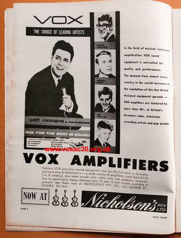 Below, June 1964, one of the first full page ads for Vox - "now for the first time in Australia" - in the Australian music press: "... due to particularly heavy demand only 10 and 15 watt models available at present.". "Exclusive" was a "Tom Jennings" word, first used in relation to JMI's distribution of Fender guitars and amplifiers in 1960. It did not mean "sole distributor". Adverts from mid June 1964 make Nicholson's role explicit however.