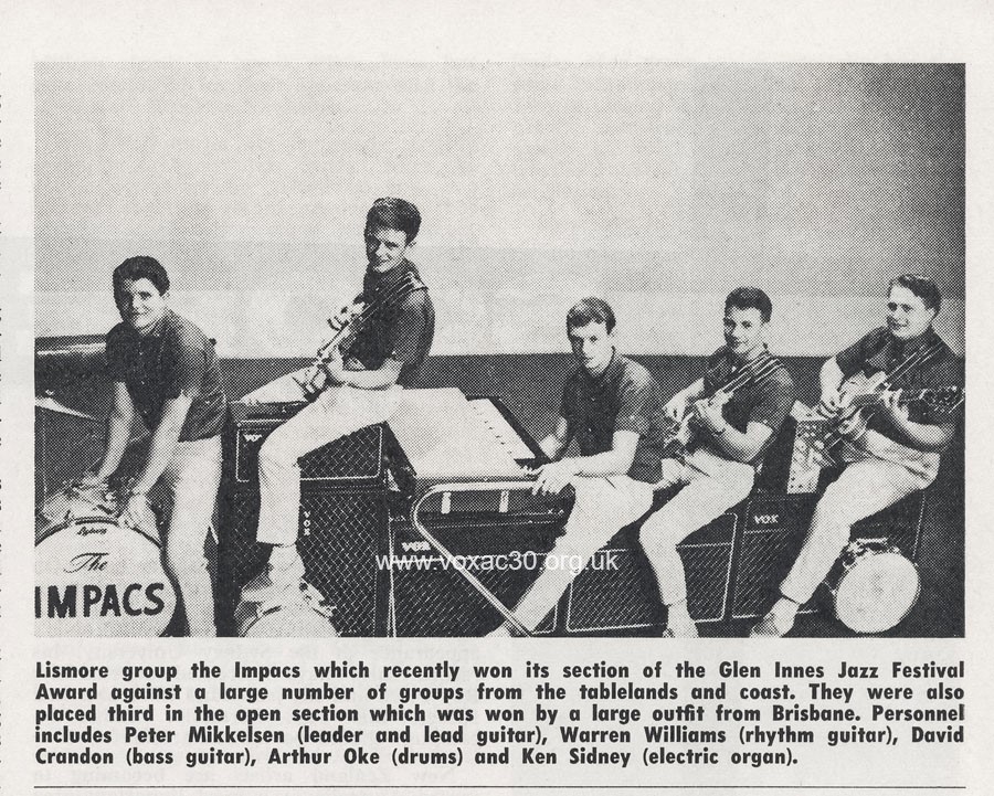 Below, "The Impacs" from Lismore, New South Wales, with a Vox Foundation Bass; two AC30 Twins; an Expanded Frequency AC30; and a Continental (with something over its keys). All are likely to have been imported by Nicholson's in Sydney.