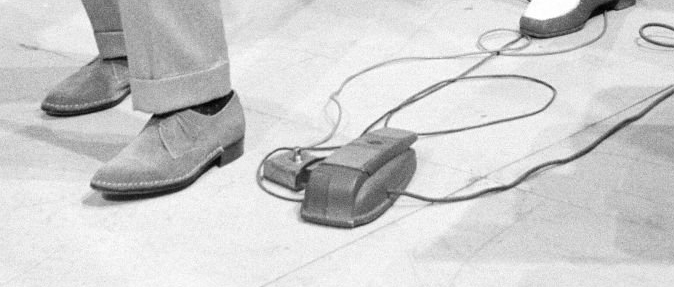 Detail from a shot of the John Barry Seven, summer 1959, footswitch for one of the three AC15s and a Dearmond (not Vox) volume pedal.