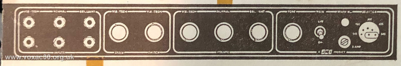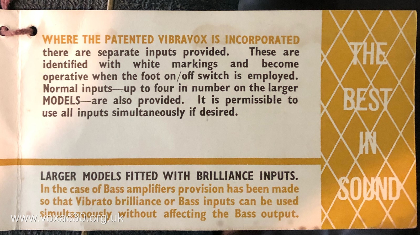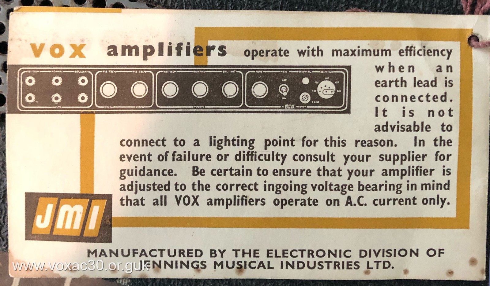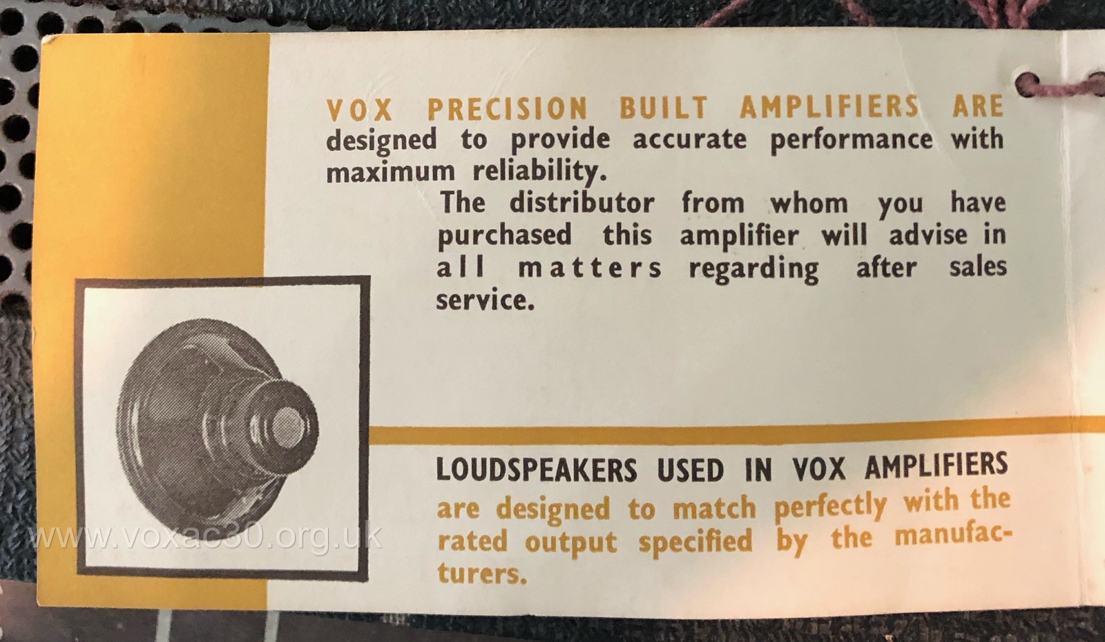 Thanks to Pat, pictures of the tag accompanying AC30 serial number 9834B (pictures of the amp are here). The tag is likely to have been designed in 1961, perhaps at much the same time as the promotional booklet with the green cover for the AC30/6. Illustrated: a Celestion blue, and an AC30/6 control panel with white knobs. presumably simply for clarity.