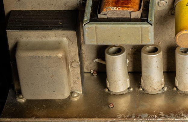 In terms of date codes, really the usual spread: cathode bias resistor and electrolytic caps with "UG" = July 1963; original yellow-print Mullard ECC83s with paint code "LA" = January 1964.