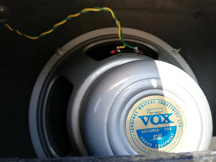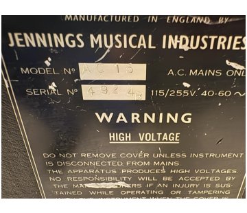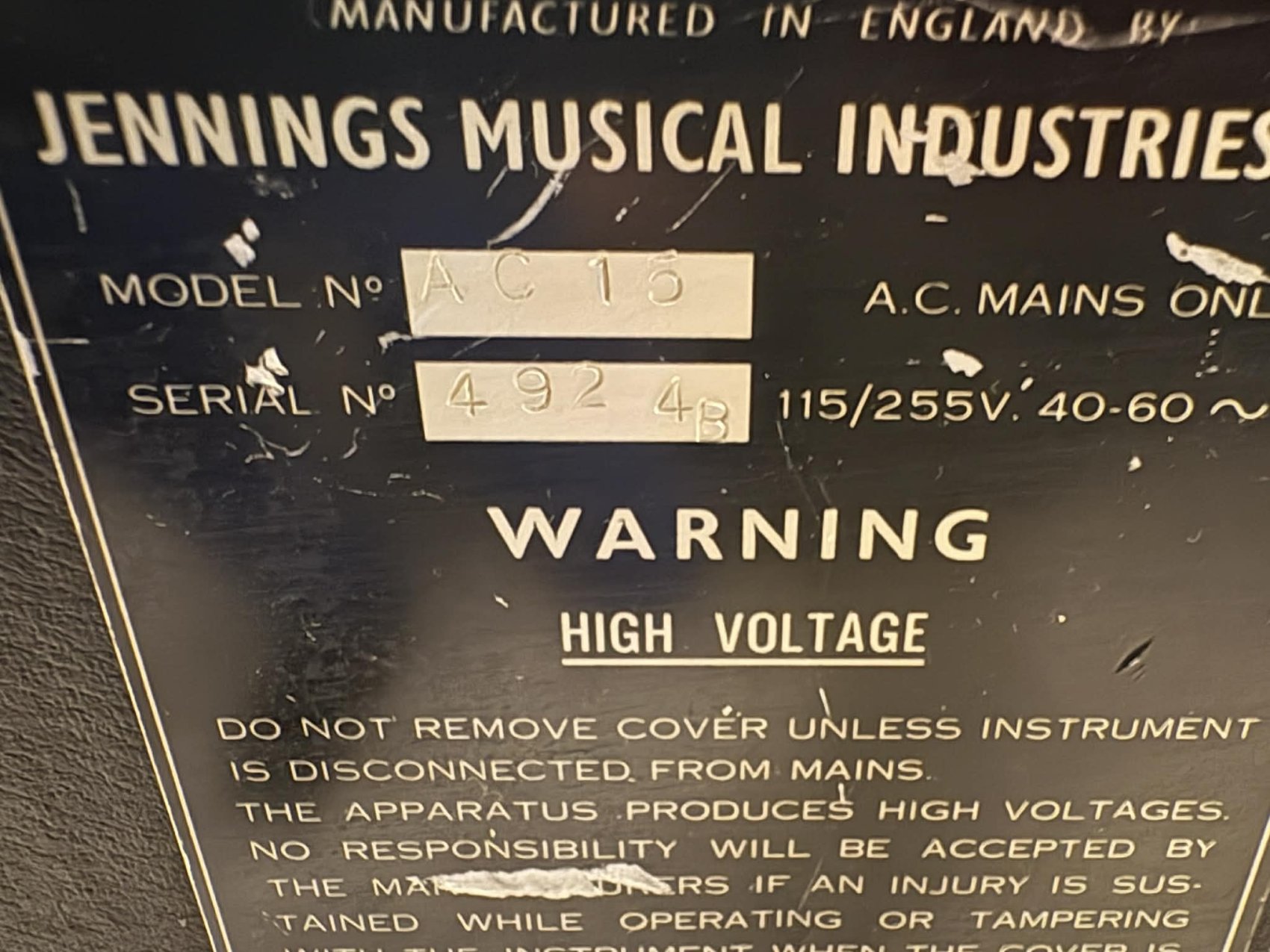The Audiom 60 was generally Jennings's preference early on for AC15s and later a number of AC30s, primarily normal resonance (blue label), only one genuine example so far of bass (red label): AC15 serial number 4254.