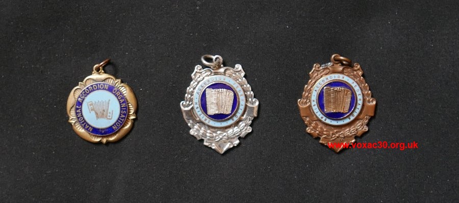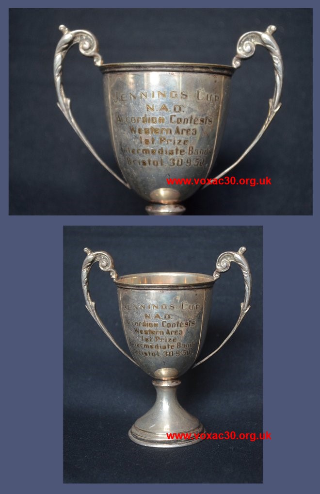 Below, a member's badge, and small silver and gold medals. These last were awarded during the country-wide heats leading up to the grand finale: "National Accordion Day", normally held in November. In company with Selmer and others, Jennings sponsored a cup for the winners or runners-up in various chosen categories (i.e. not the same ones every year). Tom occasionally presented the cup himself, along with the medals and awards to the other contestants in the heat.