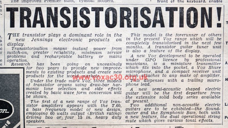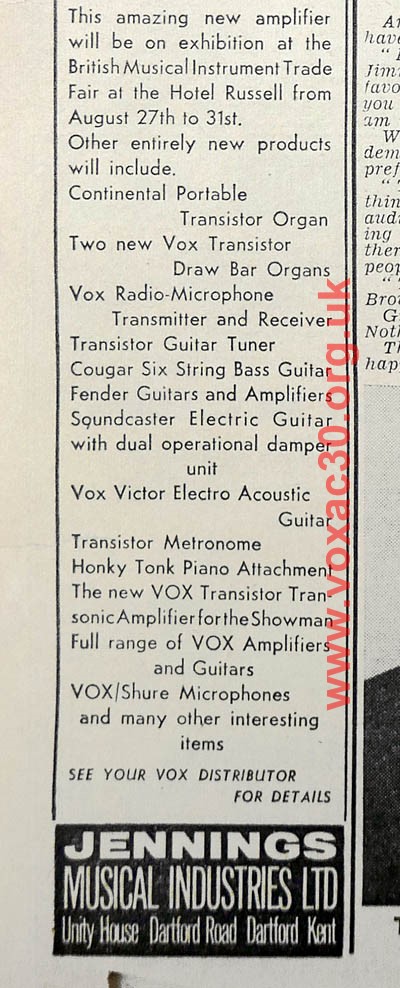 Late August 1962, a couple of previews of the Jennings stand at the Russell Hotel Trade Show, the first a brief account of the new things - "Transistorisation!" - the other a list of coming models in an advert for the T60 placed in the magazine by Tom. As far as amplifiers are concerned, the review only singled out the T60 for mention. Jennings naturally referenced both the T60 and the Transonic in its ad, the two seen in pictures taken at the show.