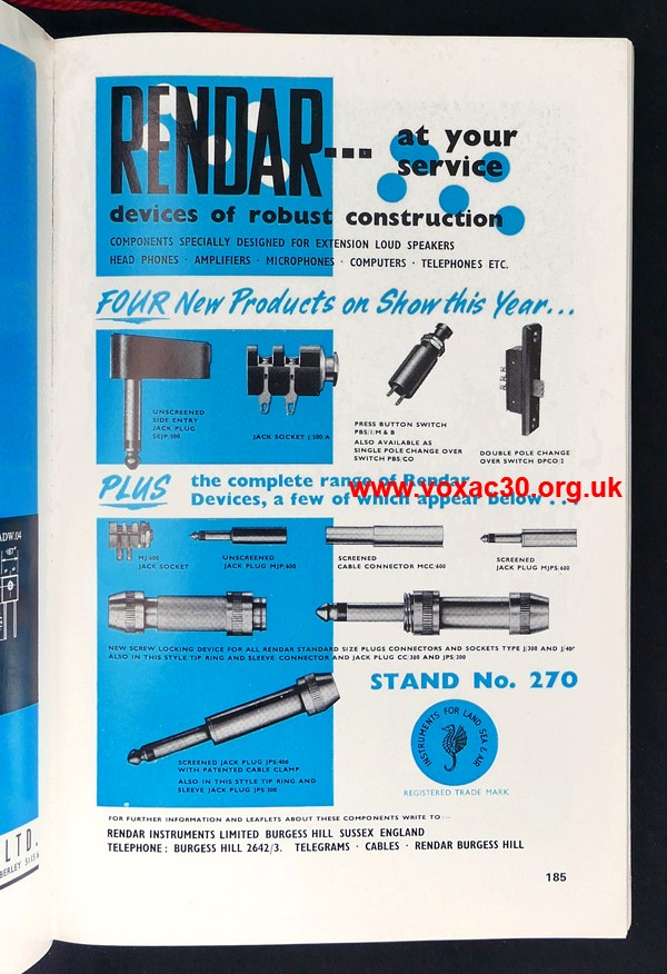 A page has now been started on Re-an jack sockets, used principally by JMI for smaller amplifiers from late 1958 to mid 1963, the move to Rendar coming at different points for different models: AC2, AC4, AC6, AC10, and AC/30.