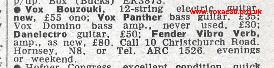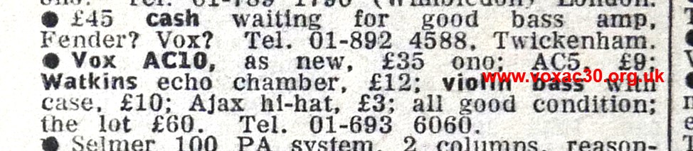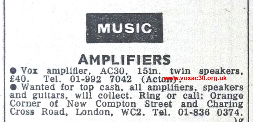 October 1968, "Exchange and Mart" magazine, an AC30 with twin 15" speakers ("Expanded Frequncy"), possibly standard production, but it could just as well have been one of the amps made up from parts purchased at the liquidation sales held at Dartford Road and the West Street Works in Erith.