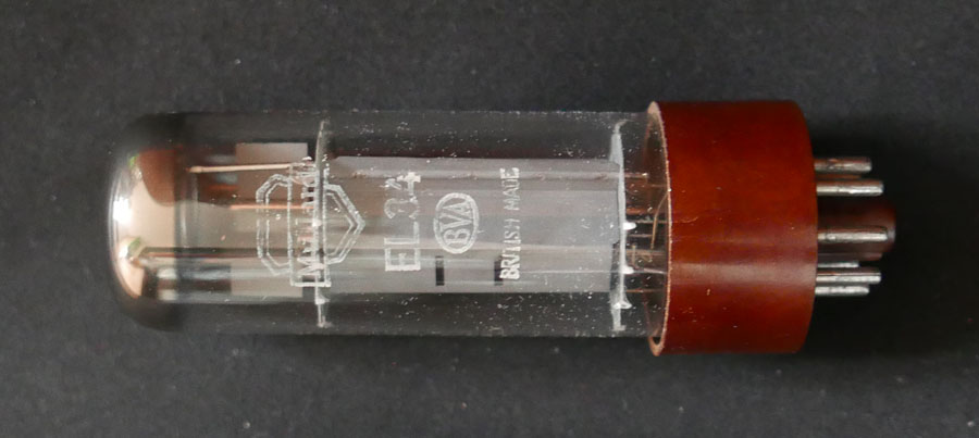 10) - the valves (probably EL34s) envisaged for the octal sockets were evidently to have been cathode biased. Each socket has its own cathode resistor and capacitor (values unknown at present). The valves in the picture above are 1970s Mullards.