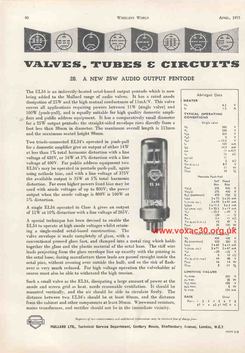 Some notes coming on the use of EL34s in Jennings amplifiers (organ and guitar) in the later 1950s. Below, a copy of one of the earliest adverts for the valve in the UK - "Wireless World", April 1955. Reports of adverts from 1952 are incorrect (probably just typos as 1952 is impossible).