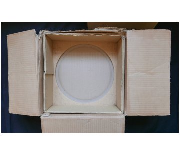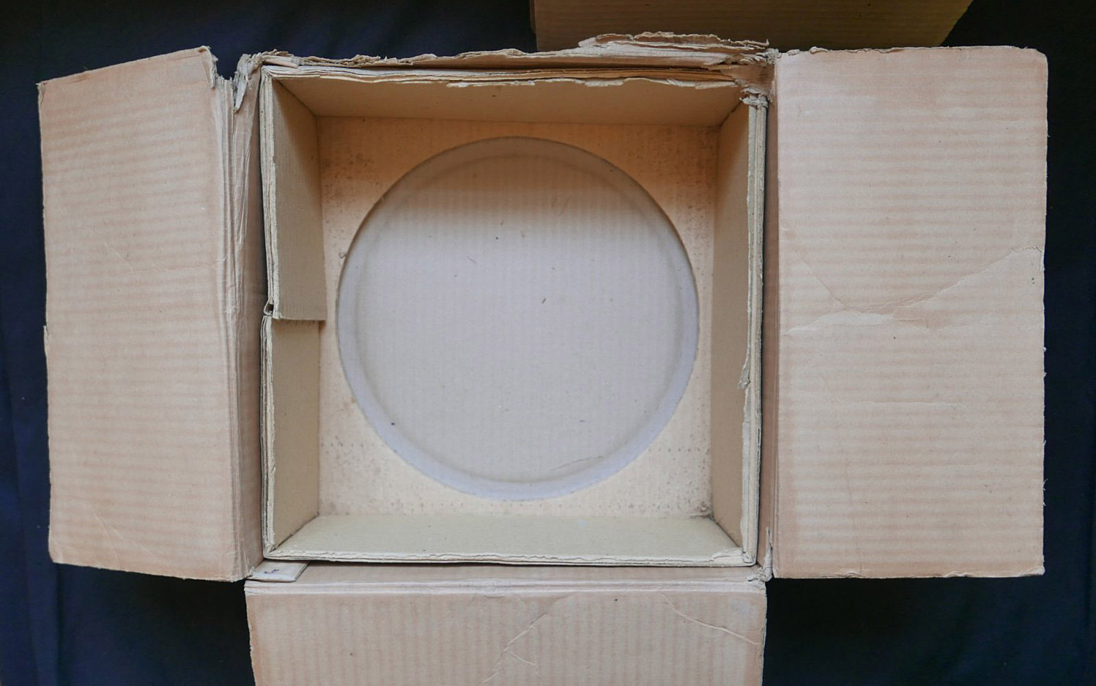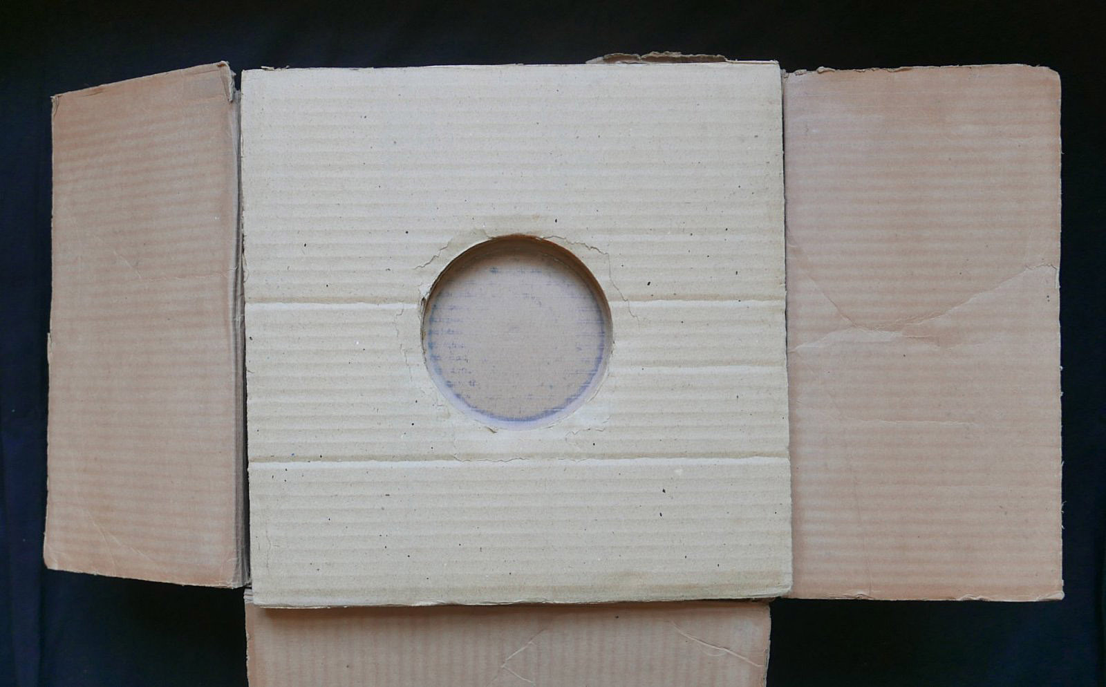 Left, three squares of cardboard stuck together and cut out to fit over the speaker end cap; right, the base: two sheets of cardboard similarly treated to secure the speaker rim.