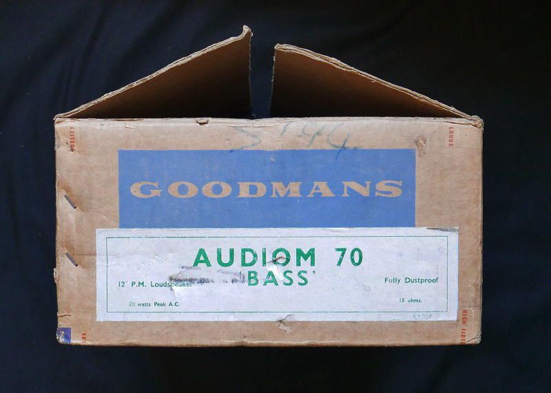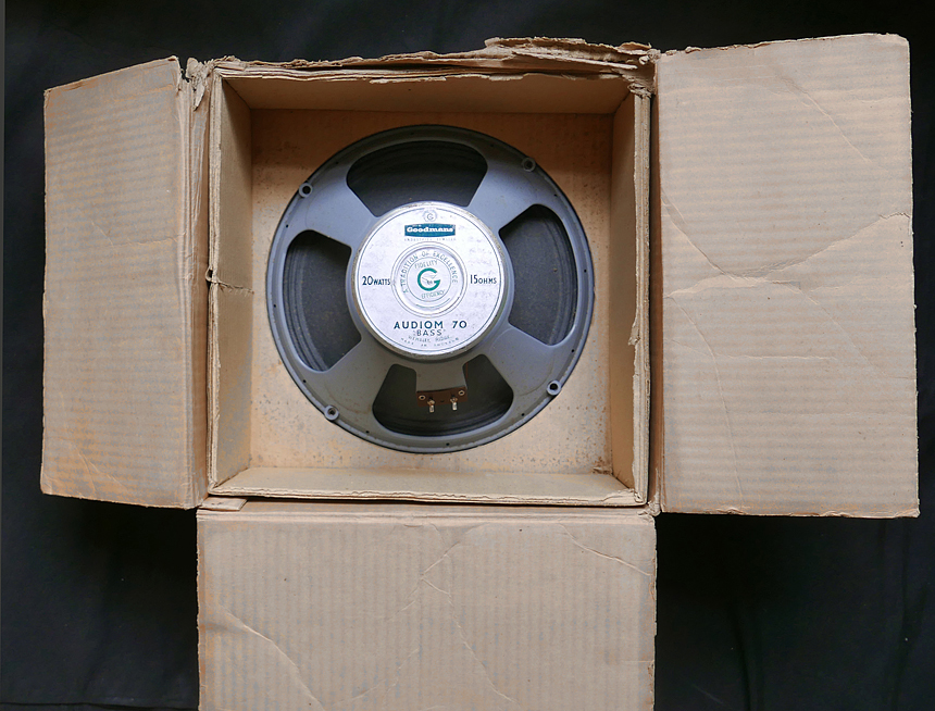 A Goodmans Audiom 70 of the type used in certain Jennings console organs. Its original heavy-duty cardboard shipping box survives. It seems unlikely that Audiom 70s were ever used in guitar amplifiers however - they are fearsomely heavy for their size.