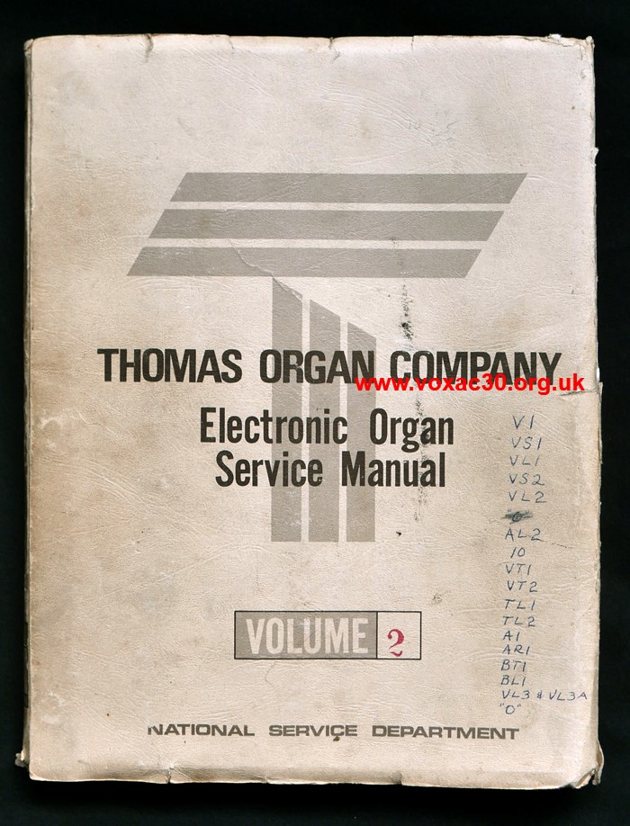 Later on Thomas revised the circuit, omitting the transformers, so some care (in terms of reference) is needed. Note that the sheet above, part of a large collection of material given away by Thomas when it closed its offices and service centre in West London (Alperton), is said to be "Schematic No. 2". If the collection, which is in storage at the moment, preserves a copy of "No. 1", details will be posted as a future update. The repeat percussion built into certain Thomas amplifiers and the V809 pedal, it should be said, has little to do with the circuits in view.