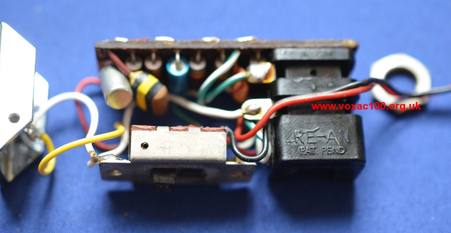 In late 1959 / early 1960, it appears that Jennings began to use Re-an, based in Dartford a few streets across from Dartford Road, for the footswitch sockets on AC/30s. Below, a detail of AC/30 serial number 4158. The same types of sockets are found also in number 4072. Re-ans do not seem to have been used for AC15s.