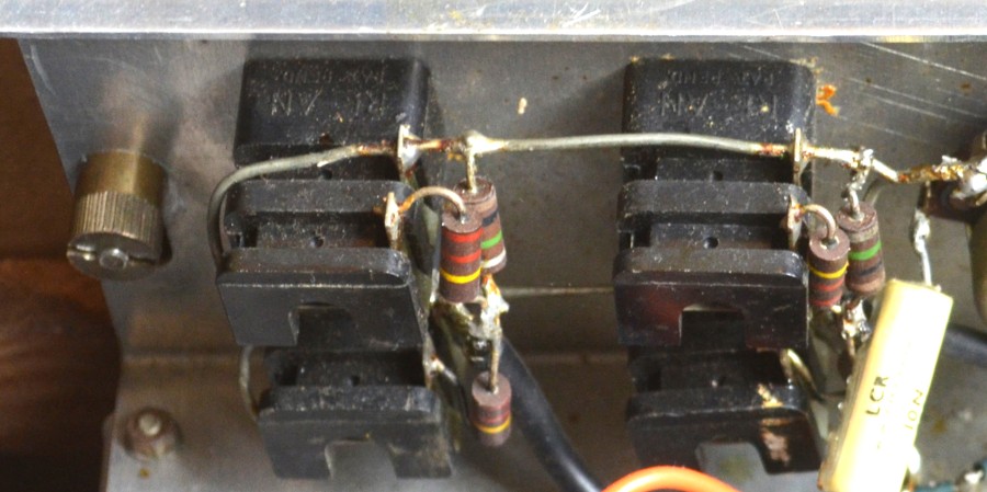 9) - a variety of makes and types of capacitor and resistor are used. The former have date codes ranging from the 1950s through to 1964, the latest being Mullard mustards with "A4N", which can only be first quarter of '64 or, not particularly likely, first quarter of 1974. Hunts electrolytics have "WDW" = 18th week of 1961 for their manufacture. There is absolutely nothing to suggest that these, or the Mullards, were "subbed in".