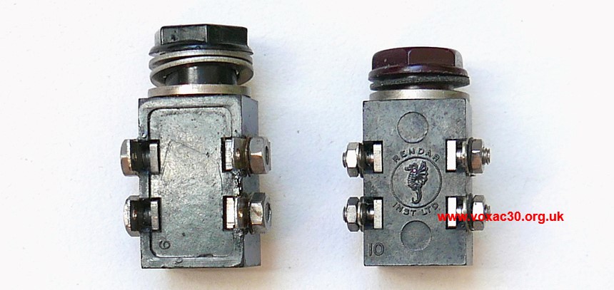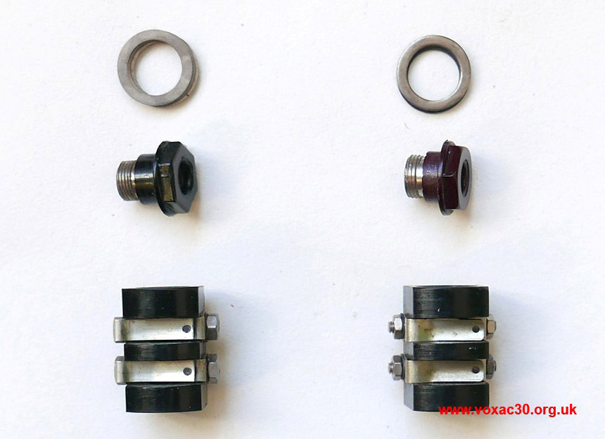 The earlier types of Rendar jack socket, used by Jennings from at least mid 1958 (AC15s with blue hammertone chassis) through to early 1962. By far the most common were those with the Rendar seahorse in a roundel. Note that the threads of the examples illustrated are different, so parts were not always interchangeable. End caps came with black, brown, olive green, red, and white nuts.