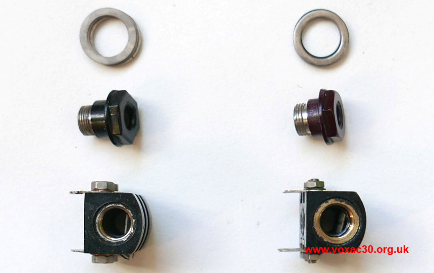 Rendar plastic-bodied jack sockets with a plastic nut. So far as one can tell, JMI began using these in early 1962. Prior to that a different type of Rendar socket had been employed - moulded bakelite, the nut part of a metal barrel that screwed into the body (to be illustrated in a coming post).