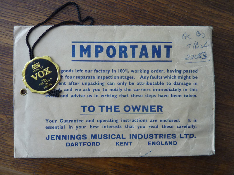 Hang tag and warranty card envelope from AC30 serial number 22053 - "T/B & C" = Top Boost and Cover.