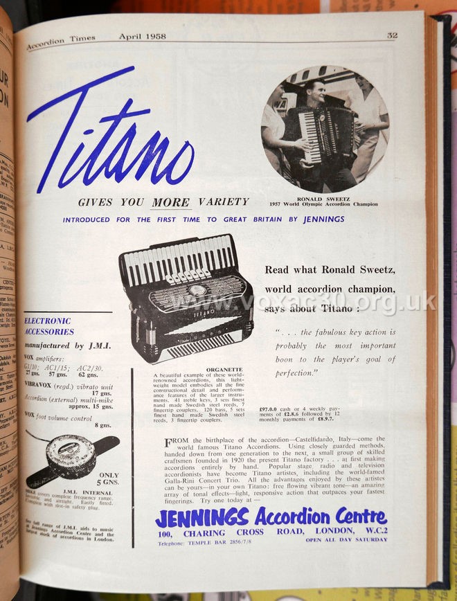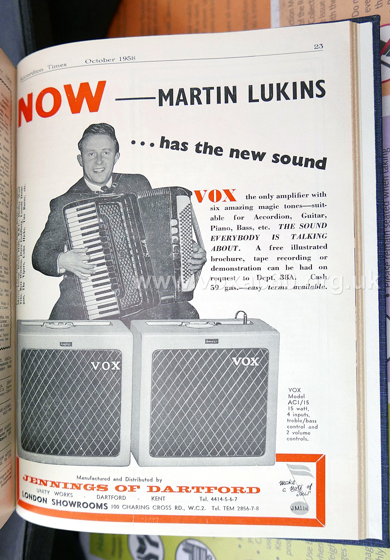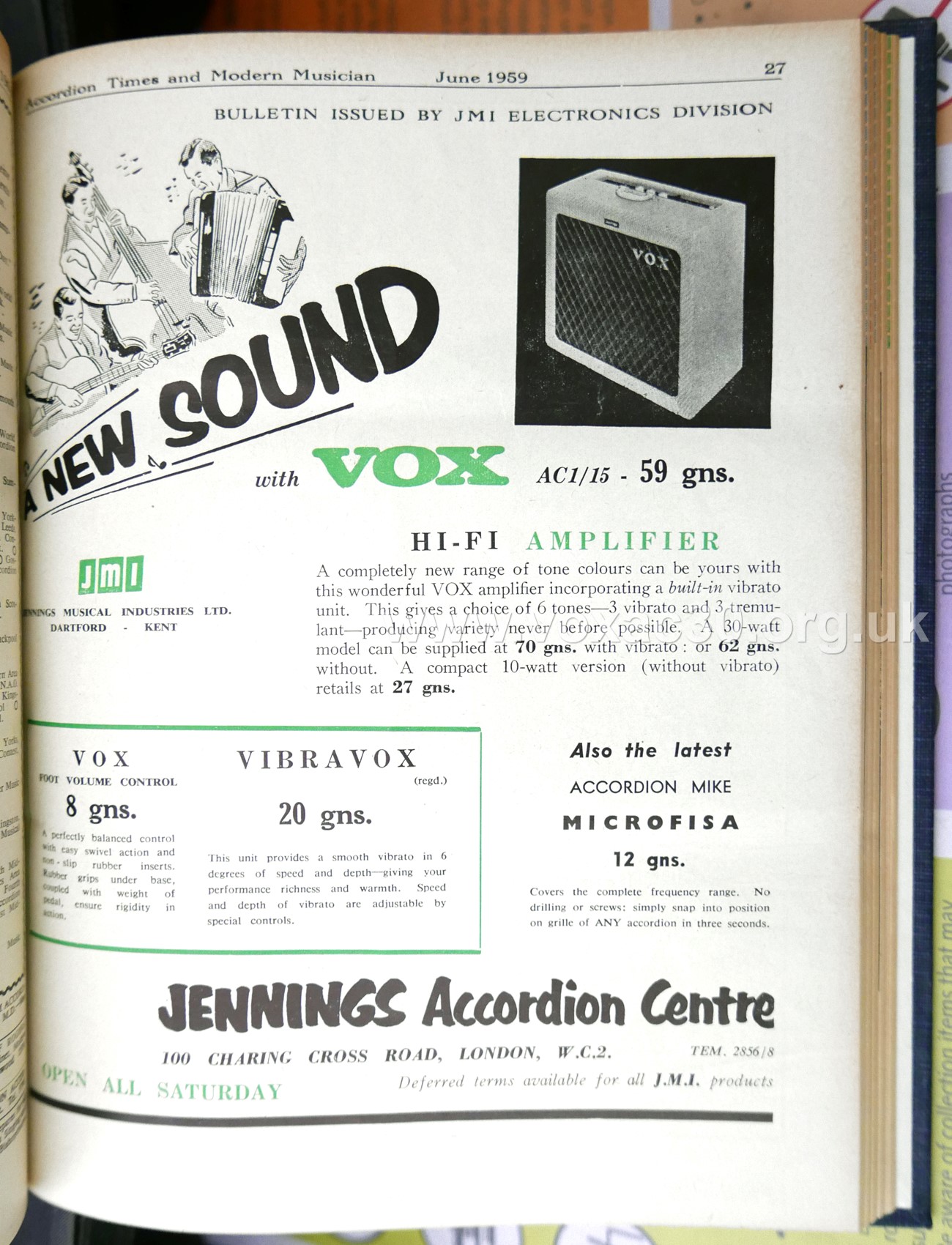 Below, a shot of the JMI advert in a tightly-bound copy of "Accordion Times", May 1960. Note the prices of Vox amplifiers on the left-hand side:
