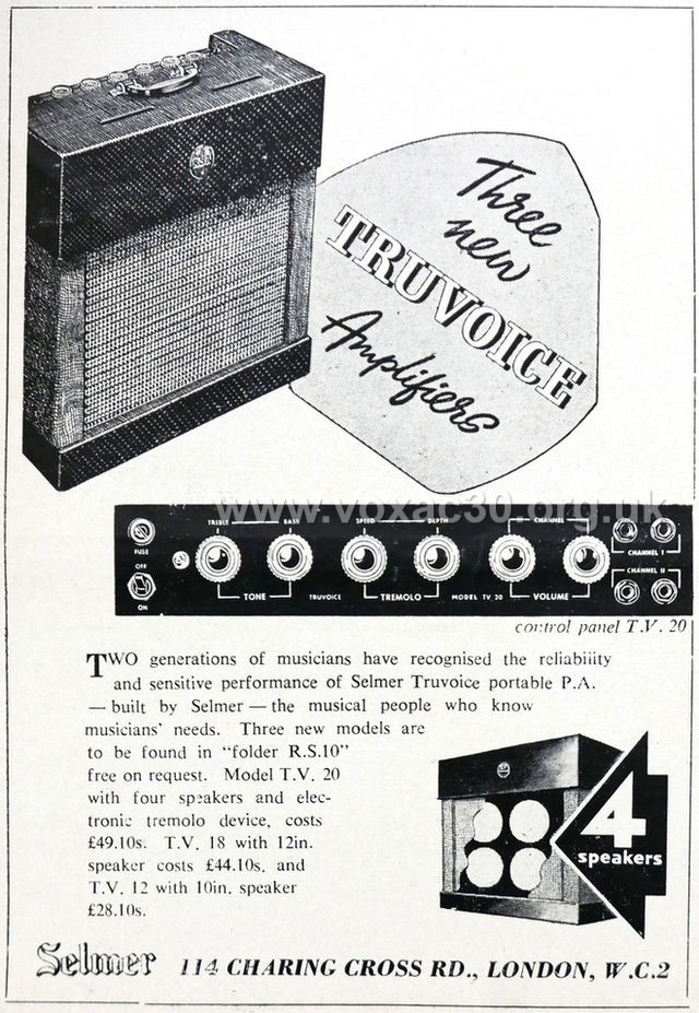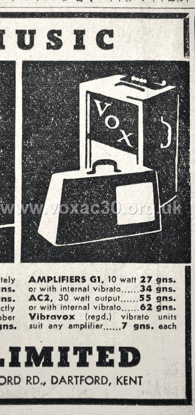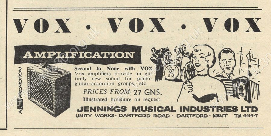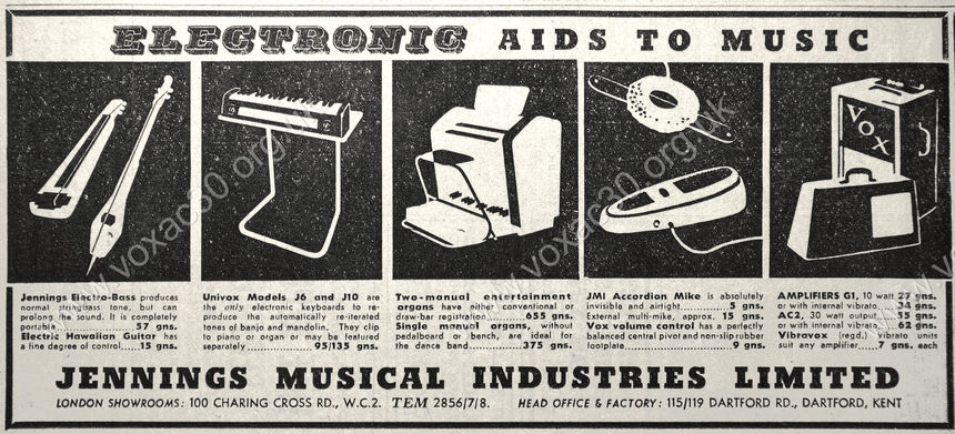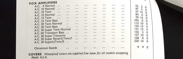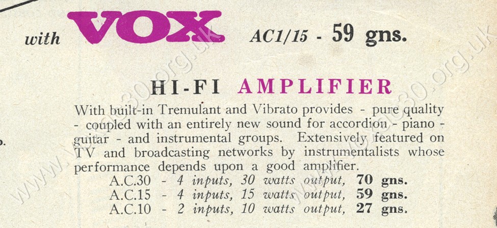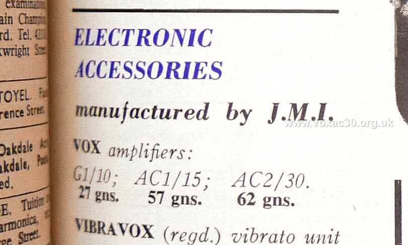 Below, a detail from the JMI advert in "Accordion Times", May 1960, referencing the line-up of models in terms of price. Single speaker AC/30 = 79 gns. New AC30/4 twin = 100 gns. "Special Bass Frequency Models for Accordions".