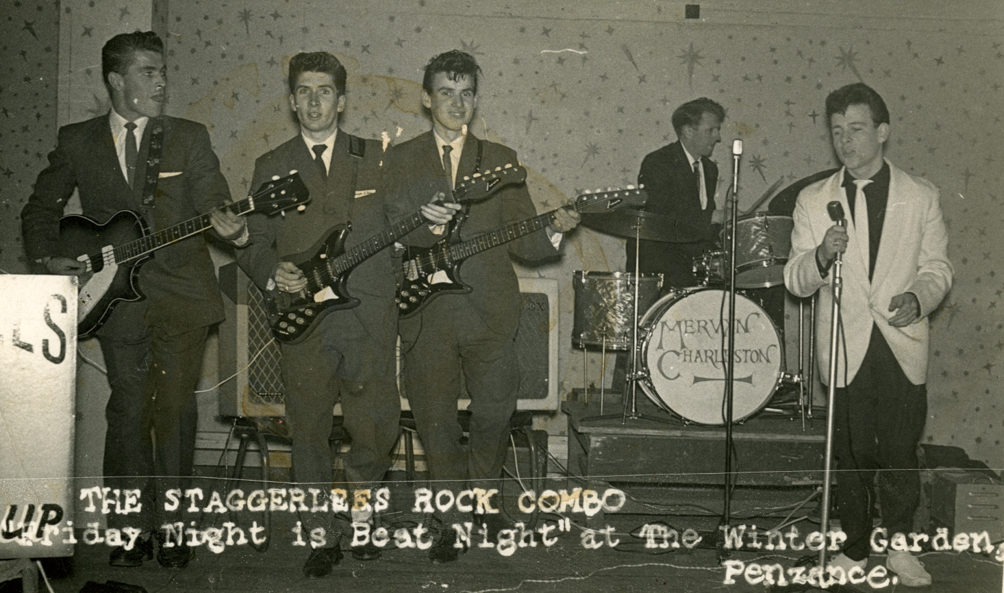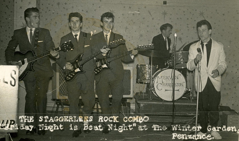 The Staggerlees at the Winter Gardens, Penzance, c. 1960. On stage, a parti-coloured single-speaker AC15 - the runner lower left on the front is "FIFTEEN" - and a TV Front AC30.