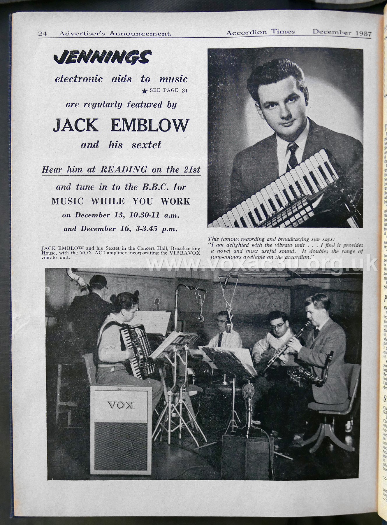 A second advert in "Accordion Times", December 1957 - this actually precedes the one a little way down this page (entry for 15th Feb.). Jack Emblow singing the praises of the VIBRAVOX vibrato unit in the AC2/30.