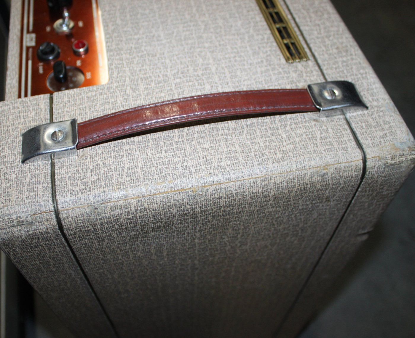 A surviving Super Twin (standard split front speaker cabinet) with brown grille cloth done horizontally. Some discolorations (from light?).