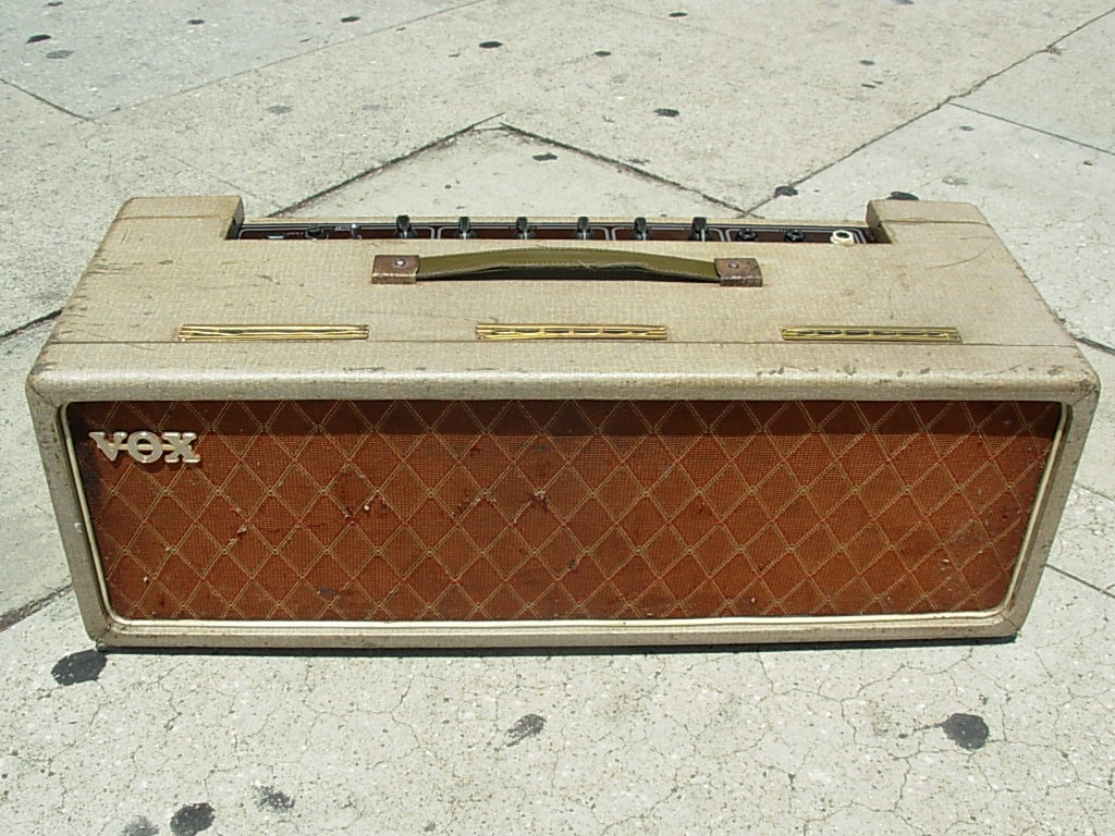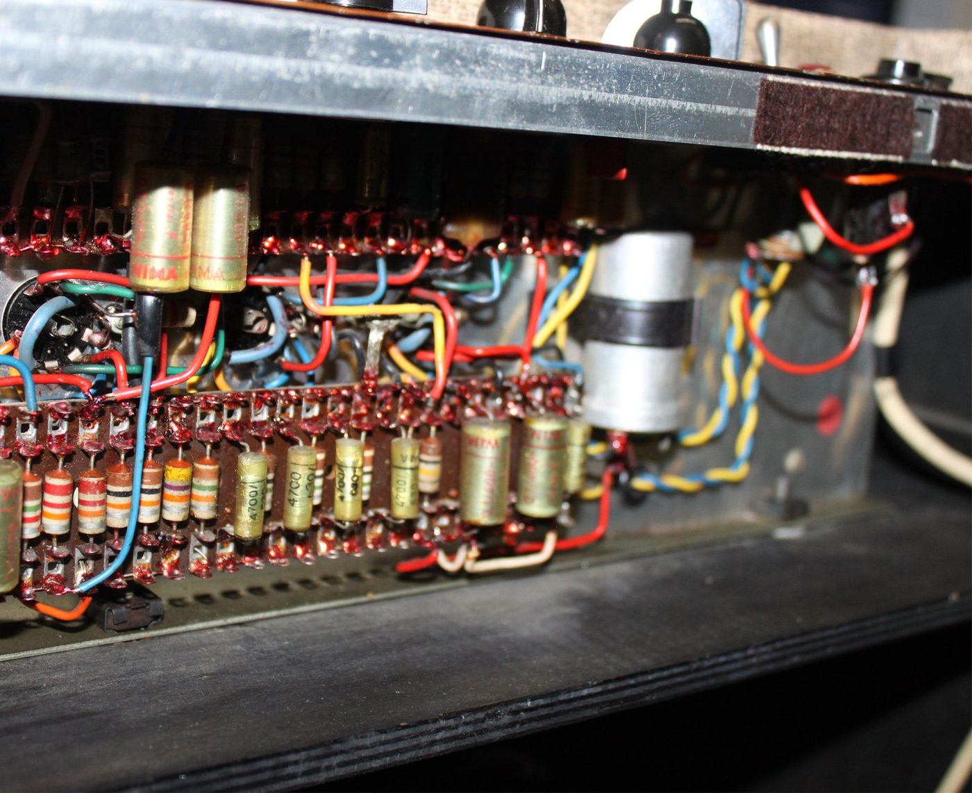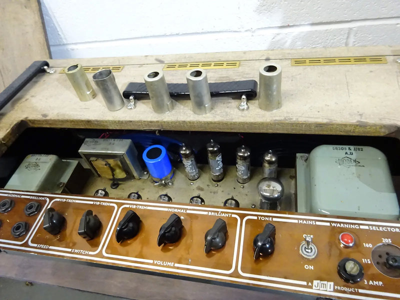 Reported as being serial number 7109B, a late beige-covered amp, at one time painted black, now for the most part cleaned off. The speakers and handles are later replacements. The green Woden transformers have the date code "AU" = January 1963. This must have been one of the last AC30s covered in beige.