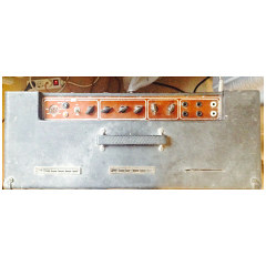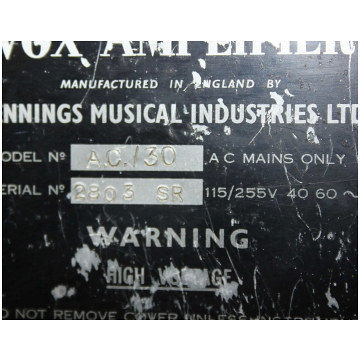 Serial number 4989 B. If box, serial number plate and chassis belong together, then a very early AC30 Super Twin amplifier section. Registered on this page. Currently (March 2020) on ebay in Germany. Probably the original black covering. Note that early amps covered in black sometimes had black plastic corner protectors. Amps covered in beige had none.