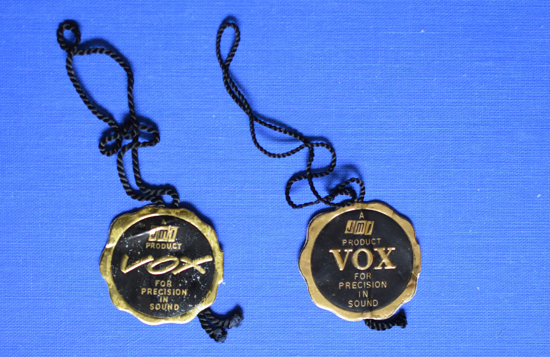 An old-style JMI tag on the left, the new style of mid 1964 to its right.