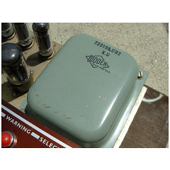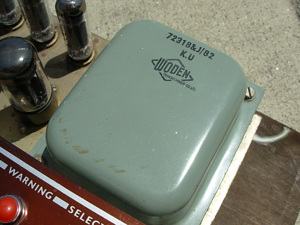 Ironically, the object as a whole is not so genuine either. The box has a fake serial number plate - three silver panels instead of two. Notice also how the scratches across the beige covering do not scratch across the plate. And given the date code on the original Woden transformers is "KU" = October 1963, it seems likely that the chassis is much later than the cabinet. A late 1963/early 1964 amp in a box from late 1962/early 1963 (note the old style single handle). Yet another case of swippee swappee.