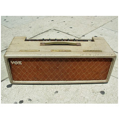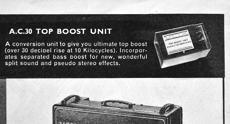 A detail from the "Precision in Sound" newspaper format catalogue of late 1964 - the AC30 Top Boost add-on unit in its box, "VOX" in old-style square letters, the legend: "TOP BOOST UNIT FOR A.C.30 AMPLIFIER". If memory serves, one of these boxes (not sure whether there was a unit inside) still survives. A picture was posted on one of the old forums - probably Plexi Palace, now long gone.
