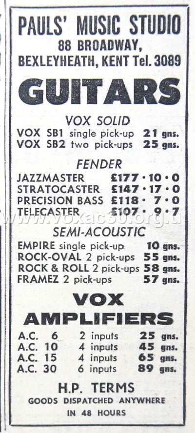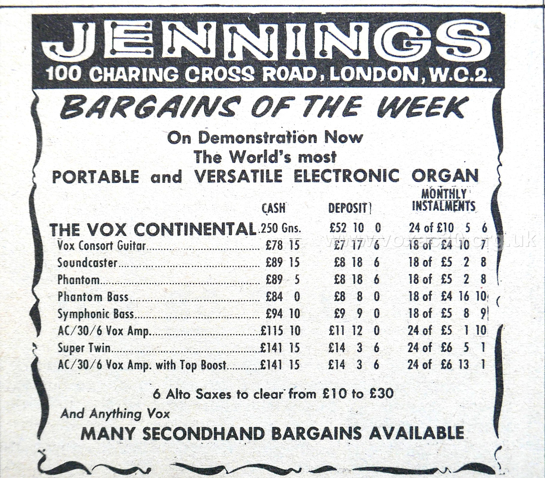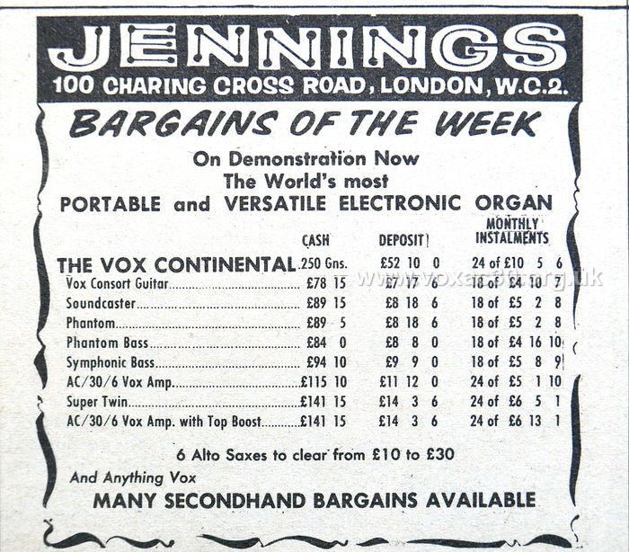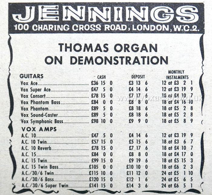 Below, some Jennings small ads relevant to the AC30 in "Melody Maker" magazine, late 1963. Hire-Purchase prices (deposit and 24 monthly payments) are given alongside the "shop" price. The page on "documents 1963" has been updated.
