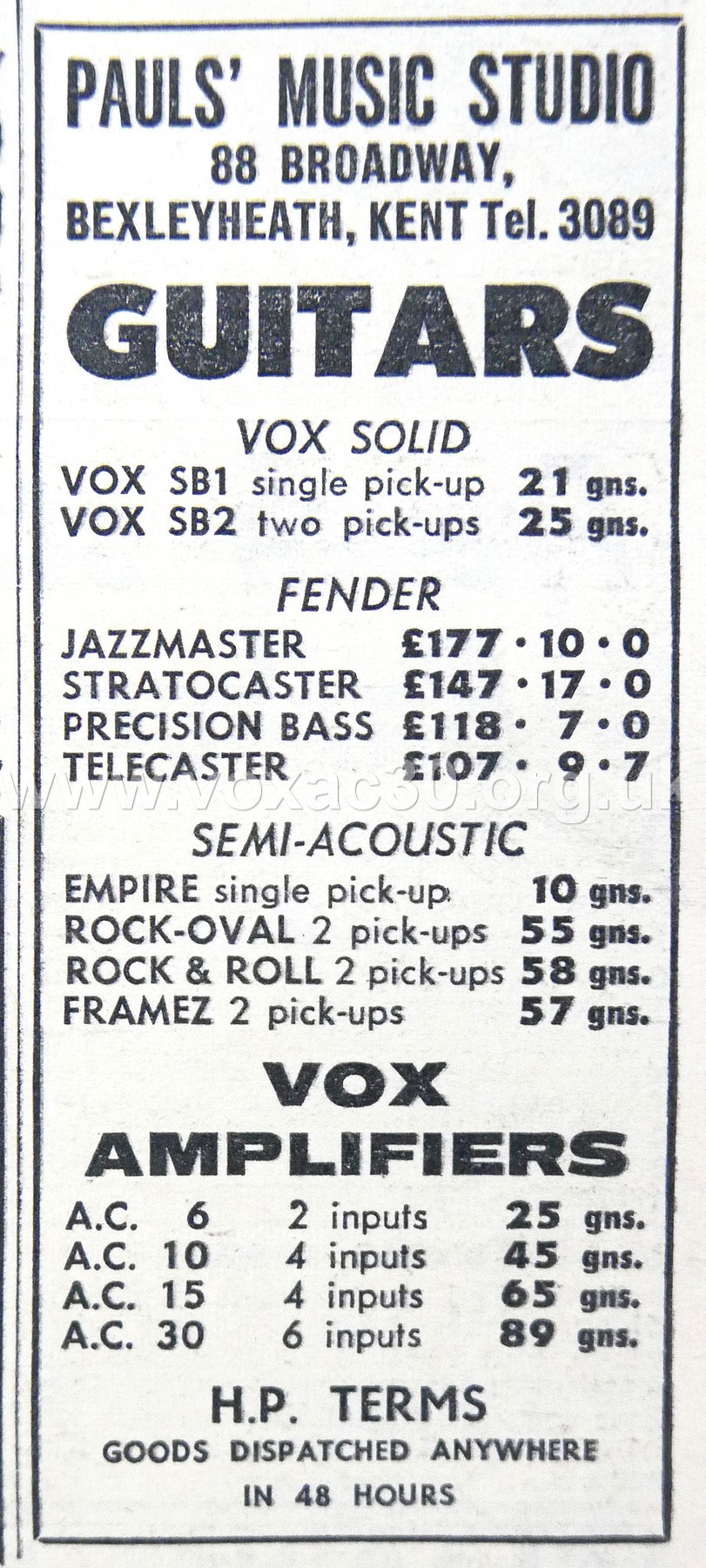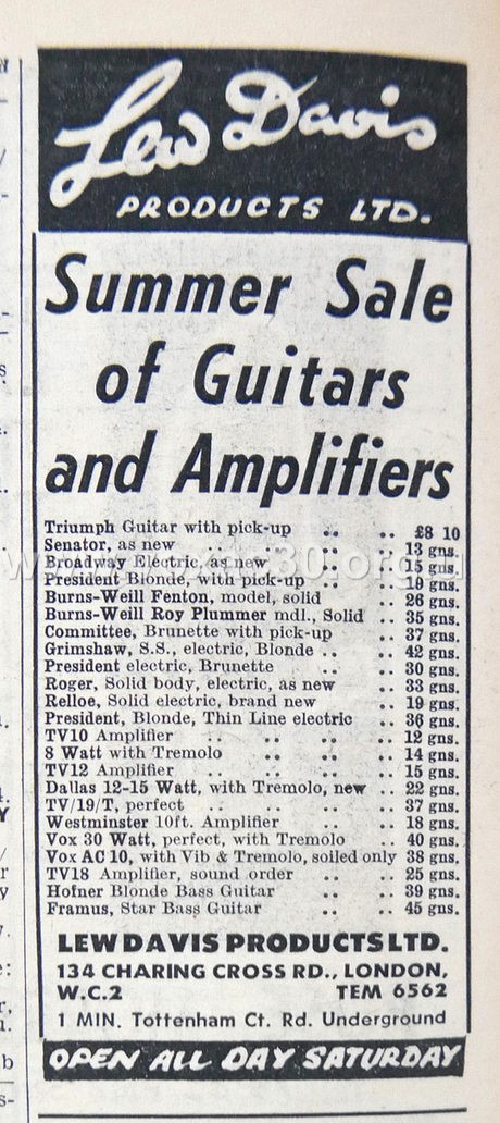 "Melody Maker" magazine, 13th August, 1960. Advert placed by Lew Davis, 134 Charing Cross Road. Note the second-hand AC30 - described as being "perfect" - for 40 guineas. An AC2/30 or a single speaker AC30? Probably the latter.
